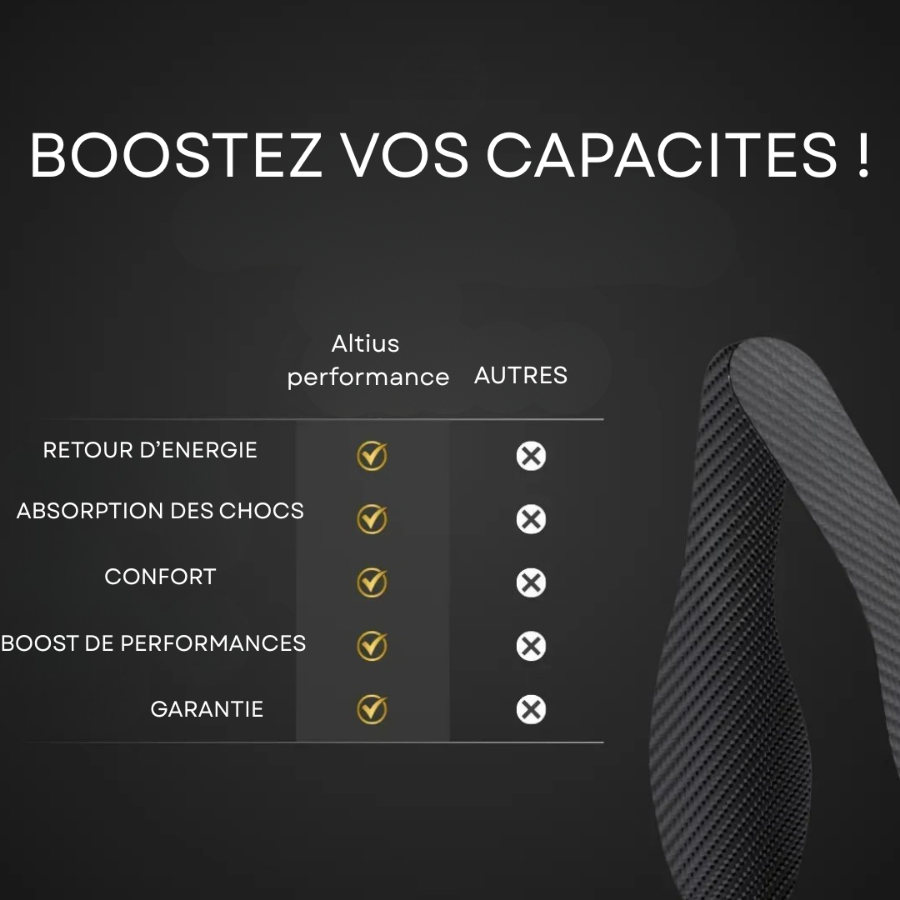 Les semelles Altius performance® exploitent le retour de la force élastique de la fibre de carbone pour projeter l’athlète en avant ou vers le haut avec plus d’énergie , et amortit les impacts afin de préserver les articulations ainsi que la force de l’athlète.